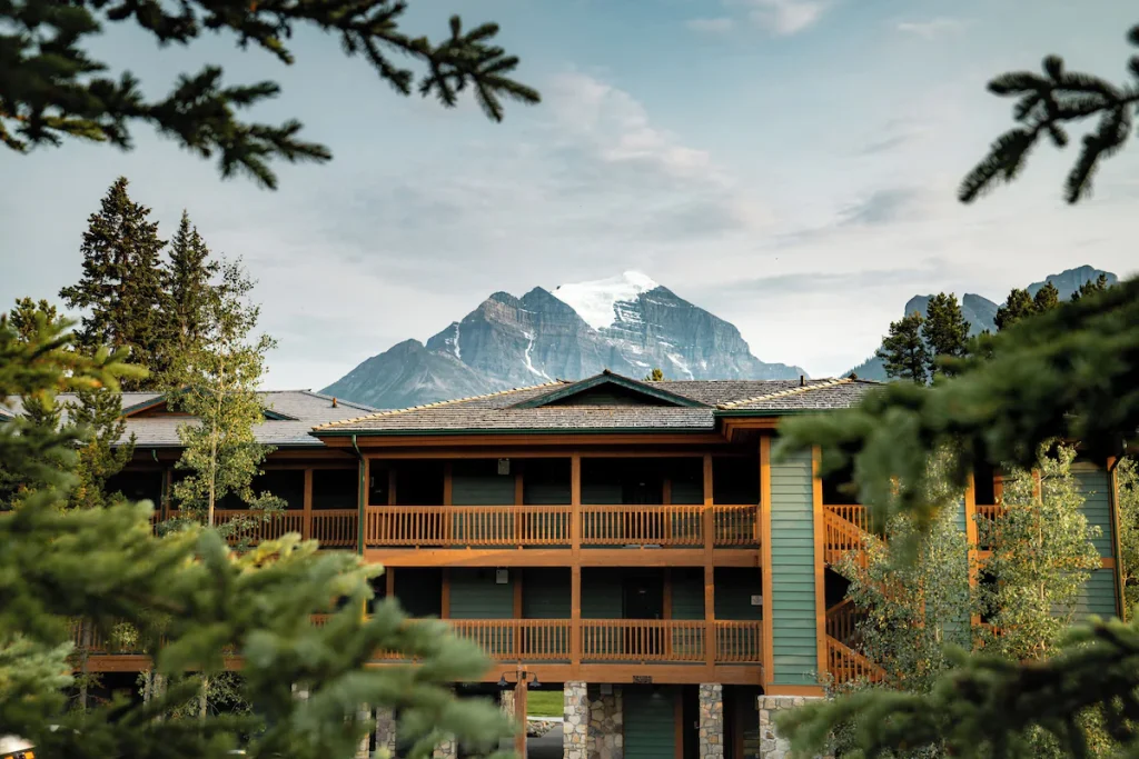 A scenic lakeside hotel set against the backdrop of the Rocky Mountains, offering stunning views, outdoor activities, and a memorable nature-focused stay.